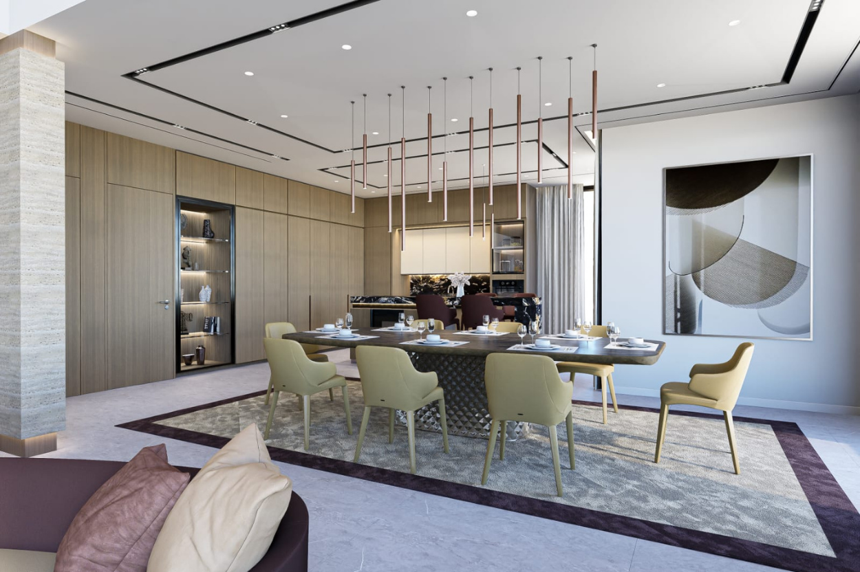 This private villa interior design project in Jumeirah Islands, Dubai focused on grand space planning for a multi-function room, bespoke furniture selection, opulent materials, layered architectural lighting, and refined detailing to create a luxurious, versatile, and timeless environment that reflects elegance, comfort, and contemporary villa living.